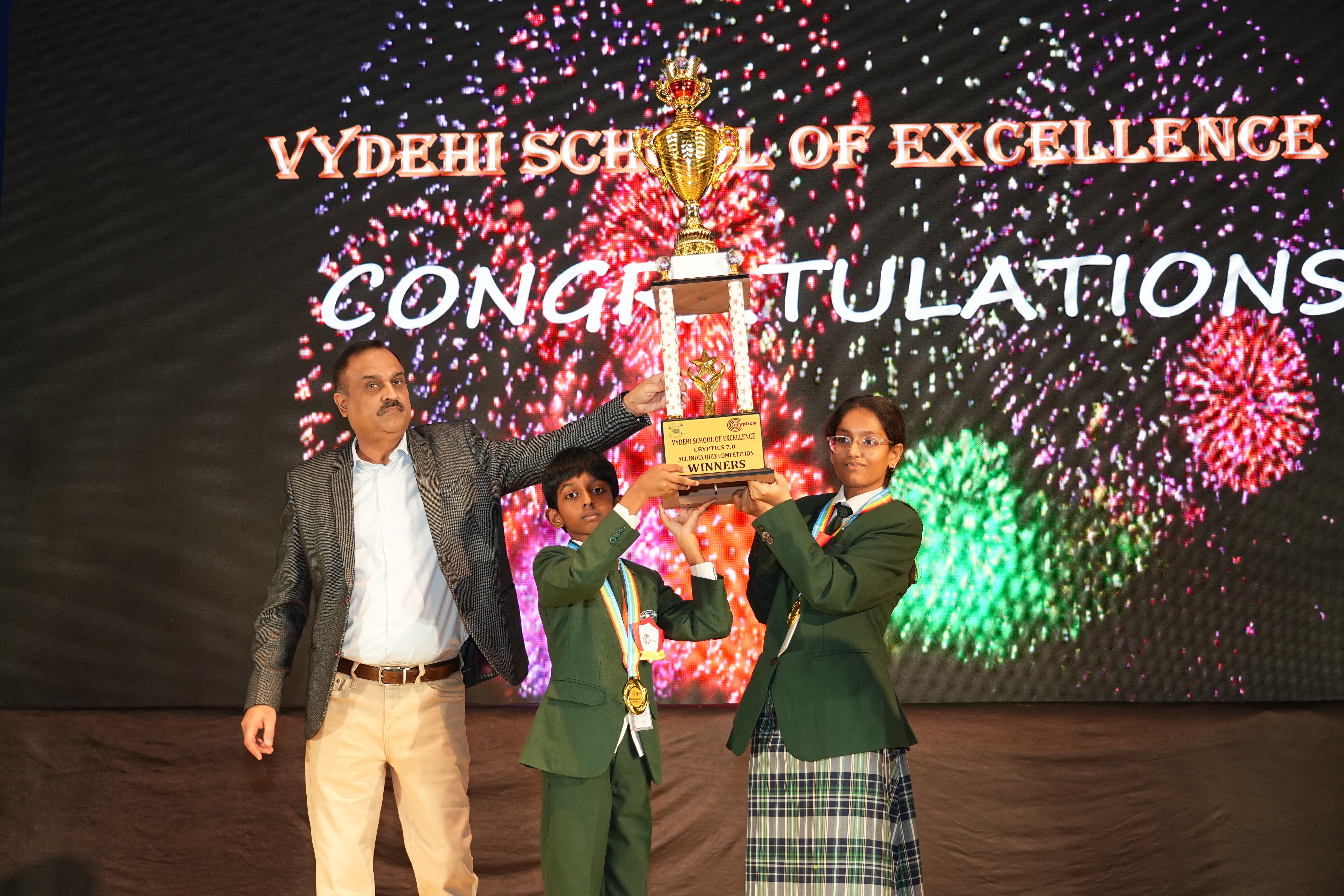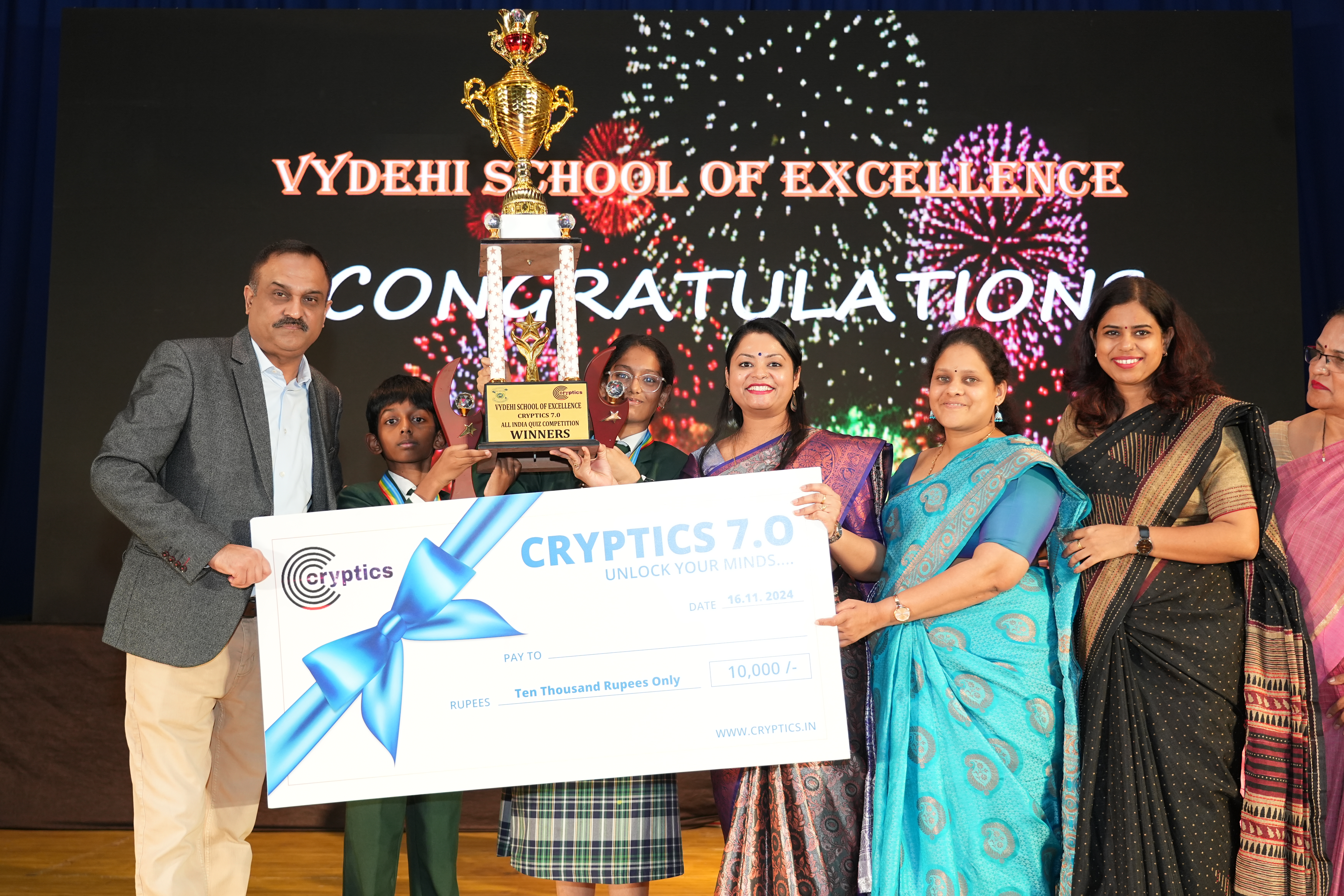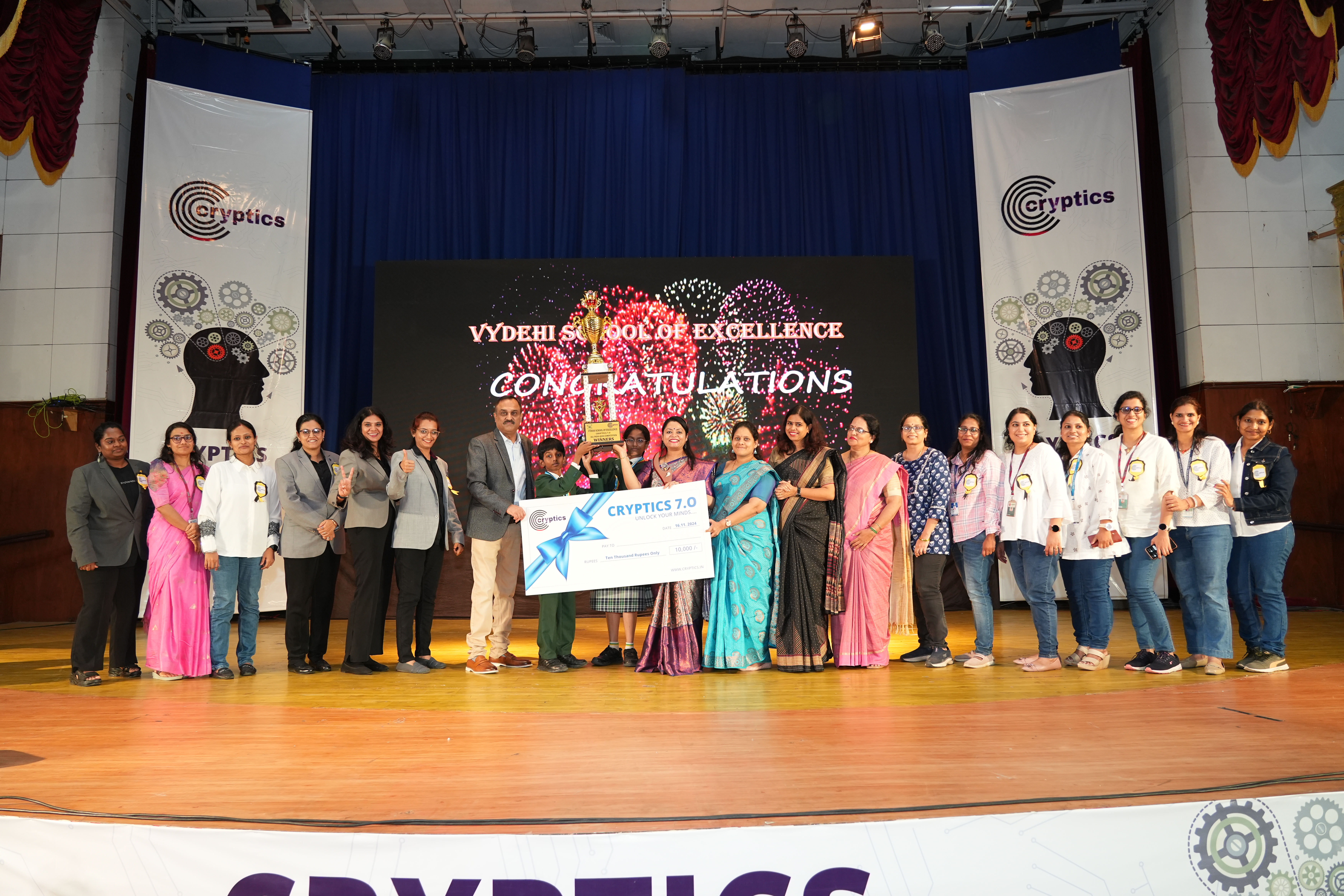 The event concluded with a grand award ceremony, where winners were celebrated, and participants were lauded for their efforts and enthusiasm. The organising team at Vydehi School of Excellence received accolades for their seamless execution and innovative approach to creating a platform for young minds to excel. Winners received a cash prize of 10K, First Runner-up were awarded with 6K & 2nd Runner-up received 4 K. The management awarded the winning team members of Vydehi School of Excellence a 25,000 cash prize each
